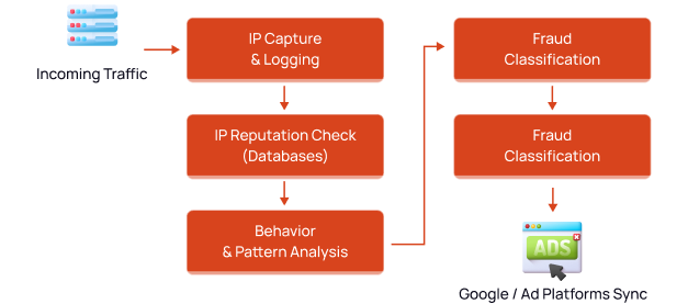 Incoming Traffic → IP Capture & Logging → Fraud Classification, IP Reputation Check (Database), Behavior & Pattern Analysis → Google / Ad Platforms Sync.