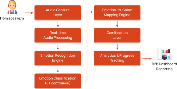 SentioEI построена как модульная real-time архитектура, в которой поток аудиосигнала проходит через слой обработки, AI-классификацию эмоций и механизм преобразования в игровые действия с последующей аналитикой прогресса пользователя.